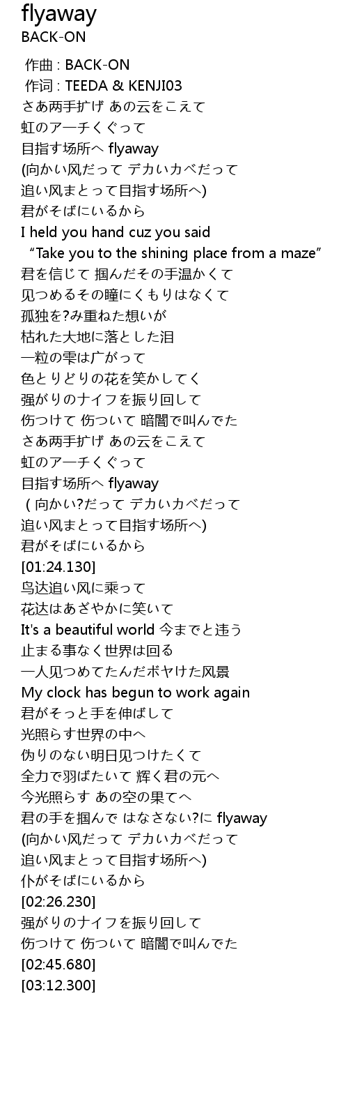 | [02:08.490] | 君の手を掴んで はなさない?に flyaway |