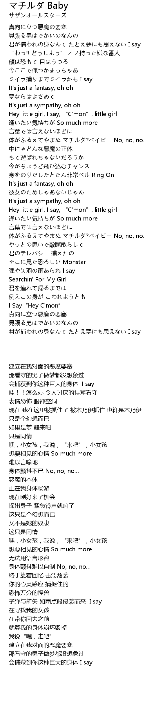 | [01:49.300] | 体がふるえてやまぬ マチルダ?ベイビー No, no, no… |