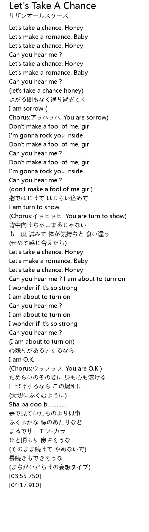 | [00:16.620] | Let' s take a chance, Honey |