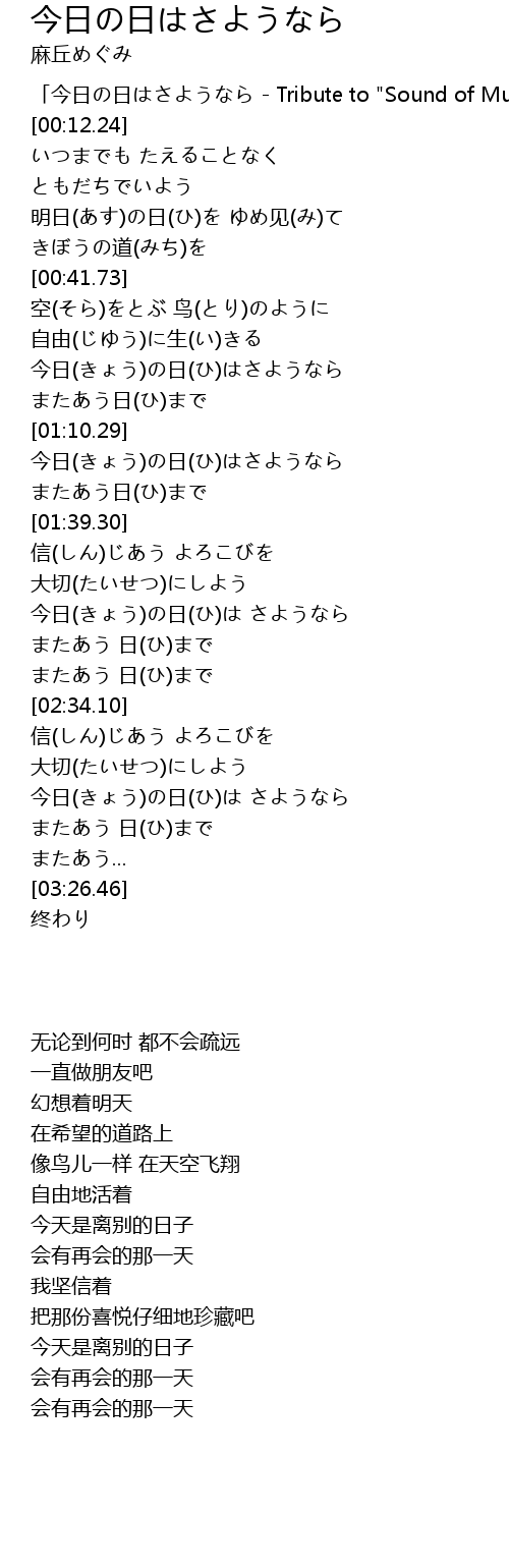 | [03:04.09] | 今日(きょう)の日(ひ)は さようなら |