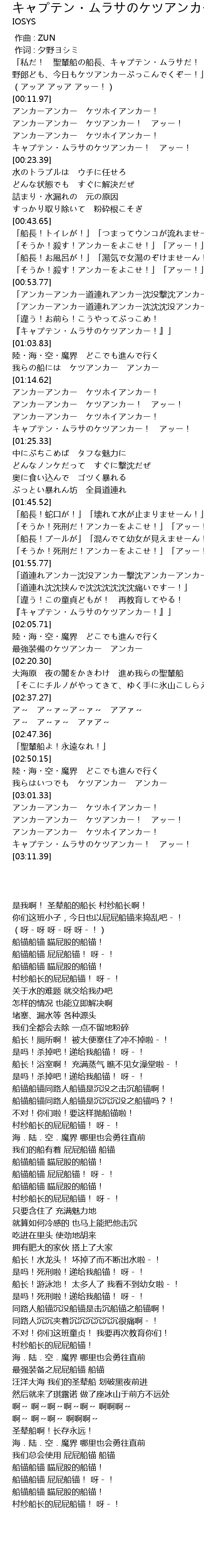 | [02:03.87] | 『キャプテン・ムラサのケツアンカー!』」 |