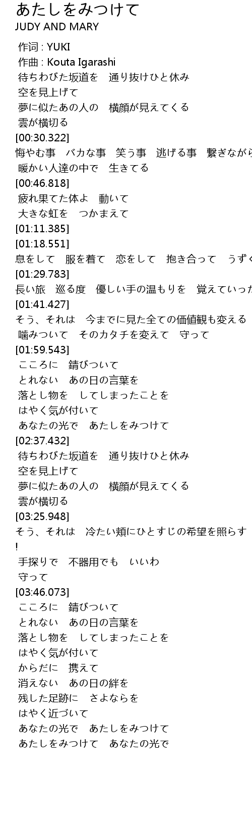 | [04:30.834] | あなたの光で あたしをみつけて |