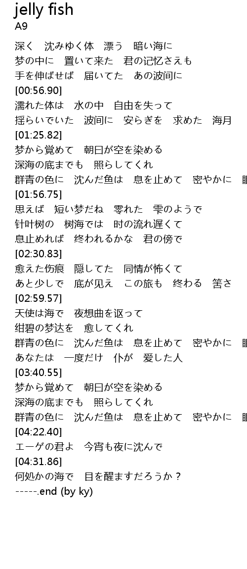 | [01:11.89] | 揺らいでいた 波间に 安らぎを 求めた 海月 |
