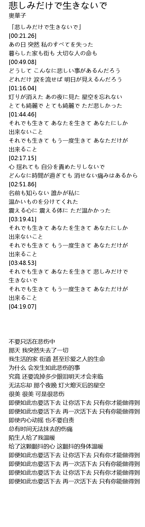 | [03:49.25] | それでも生きて あなたを生きて 悲しみだけで 生きないで |
