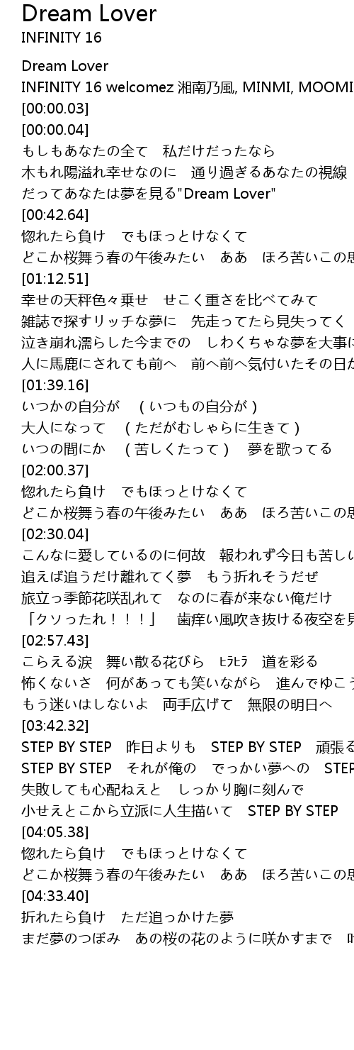 | [00:00.02] | INFINITY 16 welcomez xiang nan nai feng, MINMI, MOOMIN |