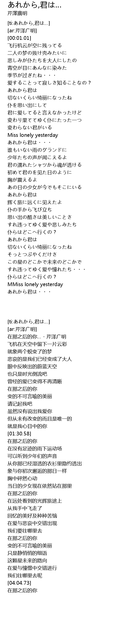 | [00:58.04] | 切ないくらい绮丽になったね |