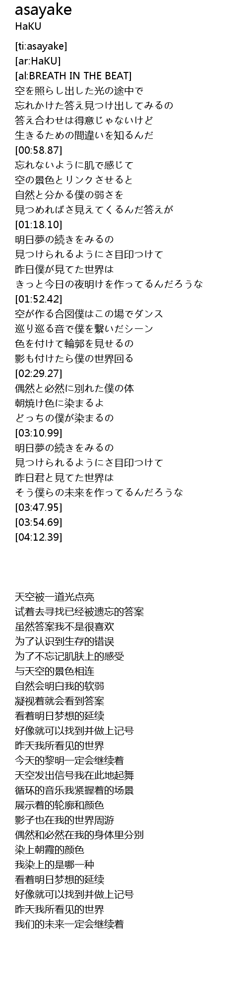 | [01:42.84] | きっと今日の夜明けを作ってるんだろうな |