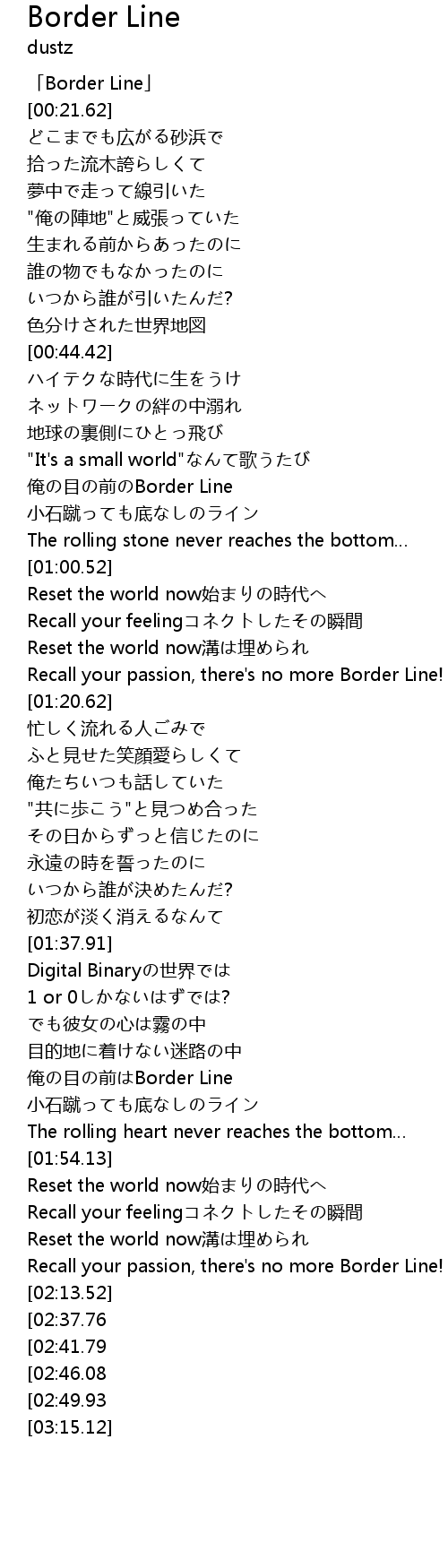 | [03:06.35][02:49.93] | Recall your passion, there' s no more Border Line! |