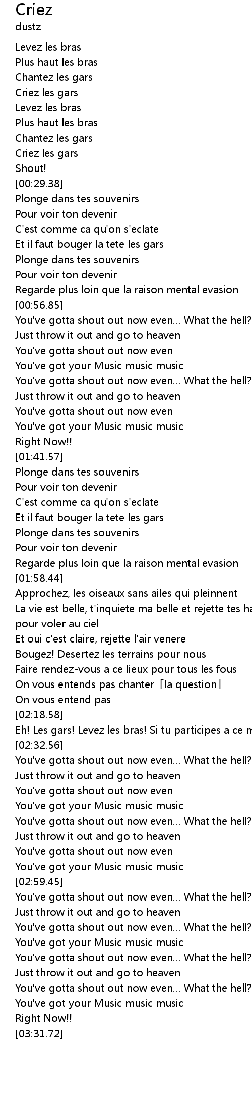 | [03:19.84] | You' ve gotta shout out now even What the hell? |