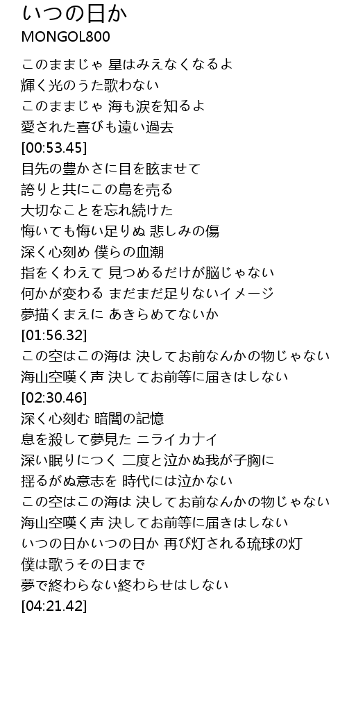 | [03:56.73] | いつの日かいつの日か 再び灯される琉球の灯 |