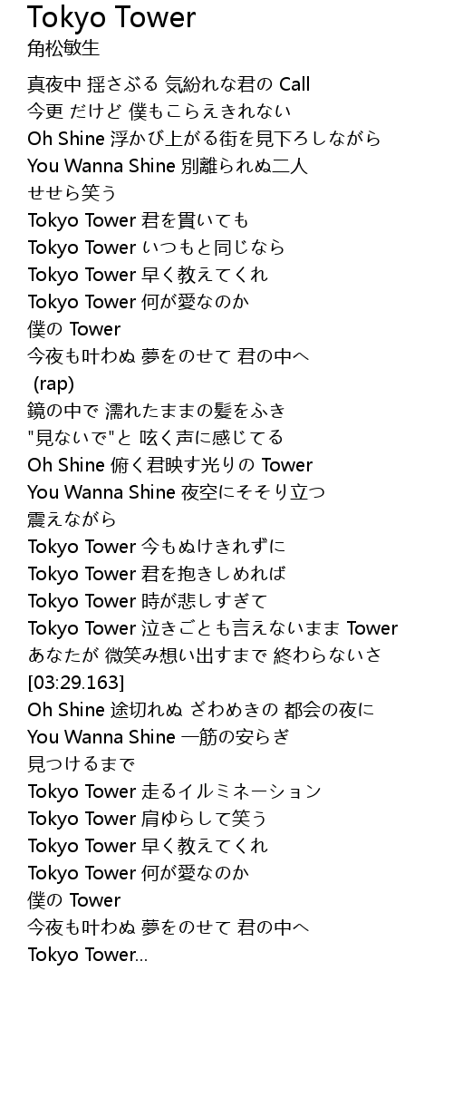 | [03:03.771] | Tokyo Tower 泣きごとも言えないまま Tower |