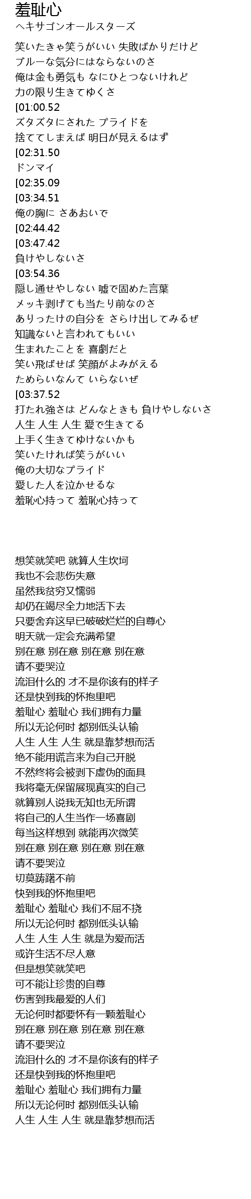 | [01:15.21][02:44.42][03:41.08] | 羞恥心 羞恥心 俺達は |