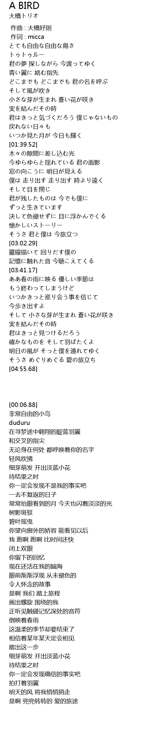 | [00:20.21] | zì yóu zì yóu niǎo |