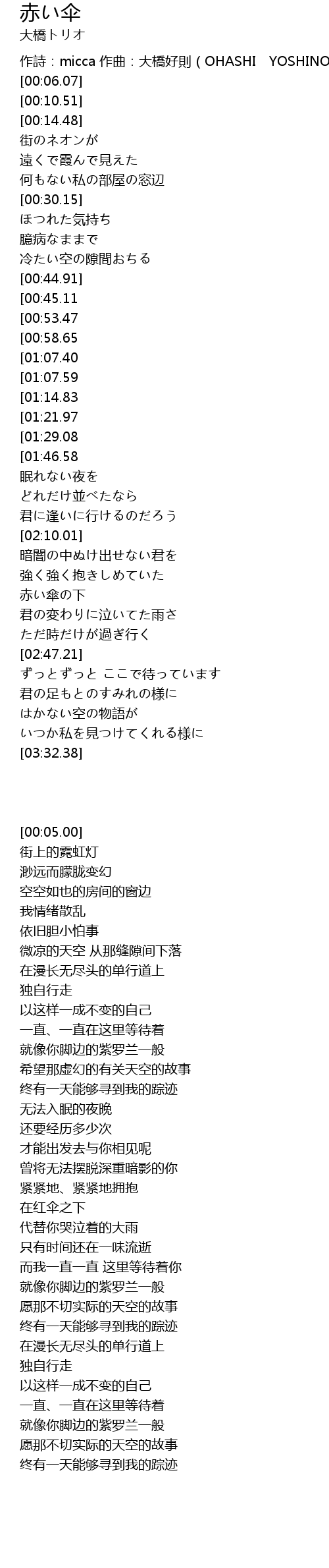 | [00:05.00] | 作詩:micca 作曲:大橋好則(OHASHI YOSHINORI ) |