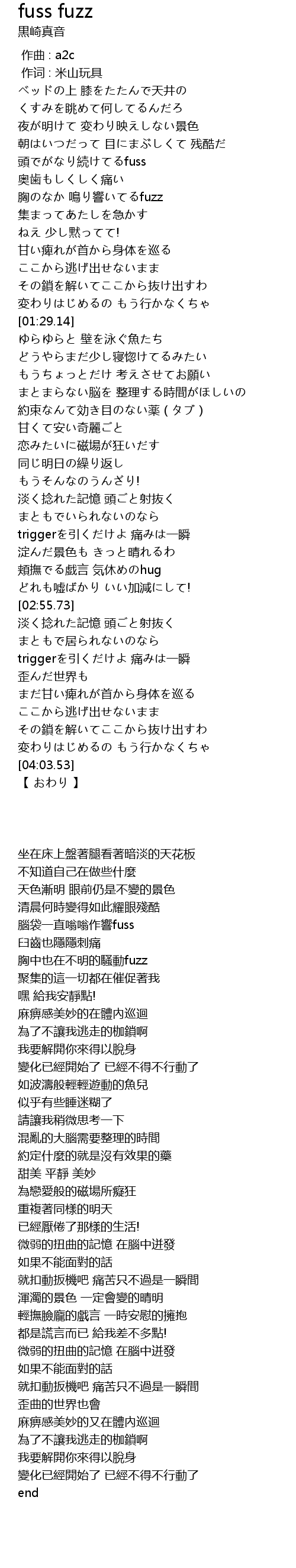| [00:44.52] | 頭でがなり続けてるfuss |