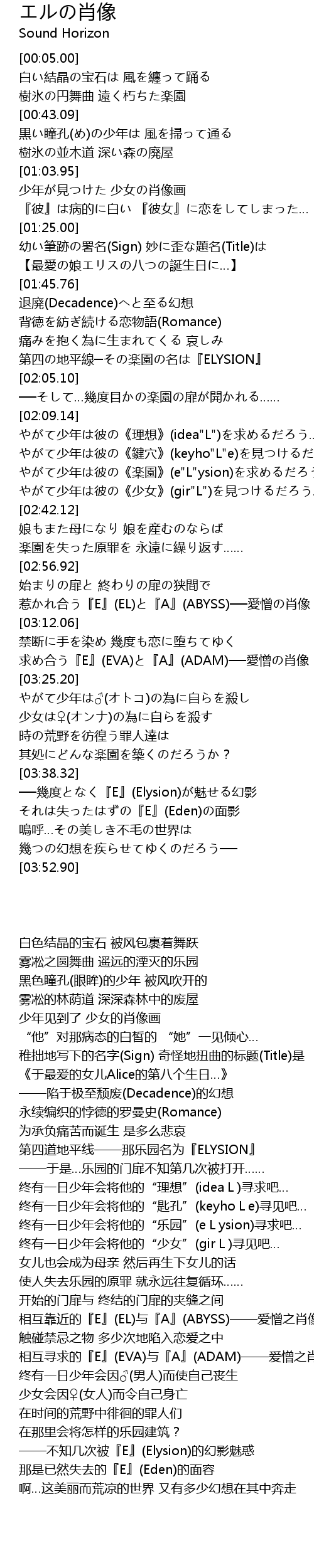 | [03:39.74] | ──幾度となく『E』(Elysion)が魅せる幻影 それは失ったはずの『E』(Eden)の面影 |
