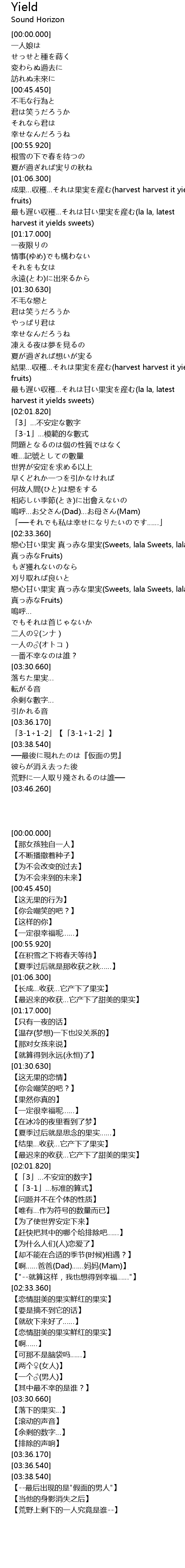 | [01:56.310] | 最も遅い収穫…それは甘い果実を産む(la la, latest harvest it yields sweets) |