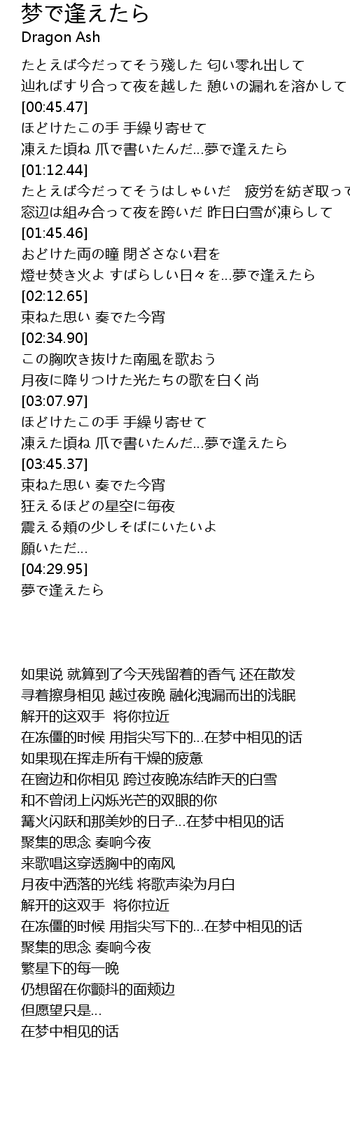 | [01:57.76] | 燈せ焚き火よ すばらしい日々を…夢で逢えたら |