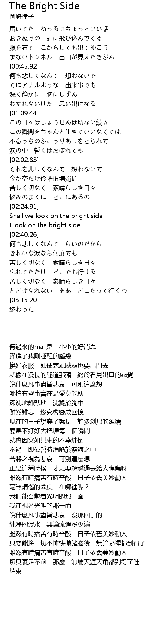 | [02:25.09] | Shall we look on the bright side |