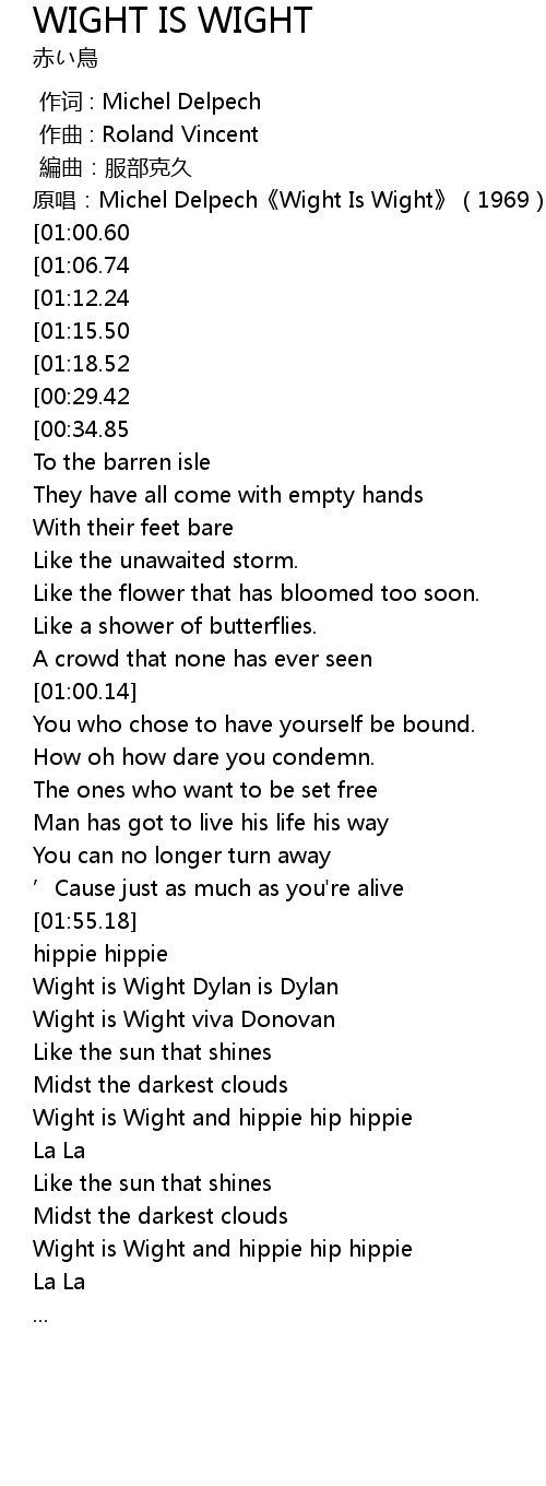 | [02:13.15][01:18.52][00:23.75] | Wight is Wight and hippie hip hippie |