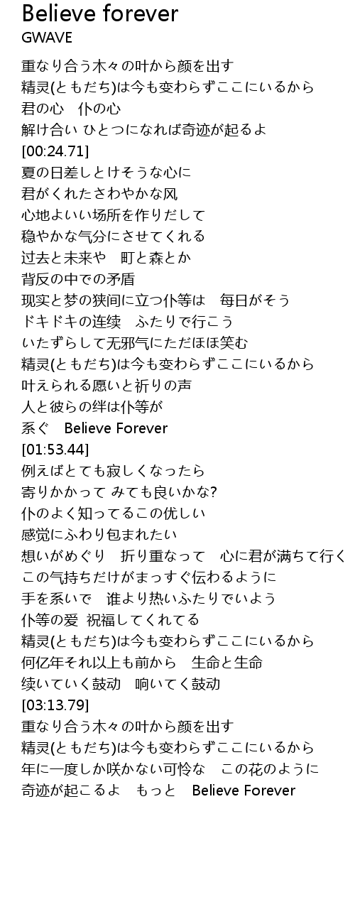 | [03:56.32] | 奇迹が起こるよ もっと Believe Forever |