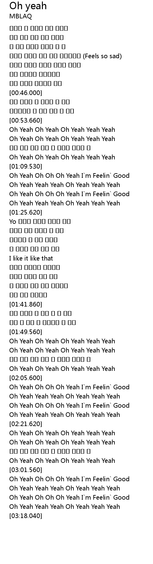 | [03:09.850] | Oh Yeah Oh Oh Oh Yeah I m Feelin Good |