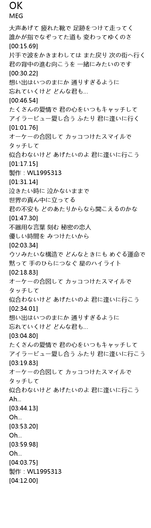 | [01:02.76] | オーケーの合図して カッコつけたスマイルで タッチして |