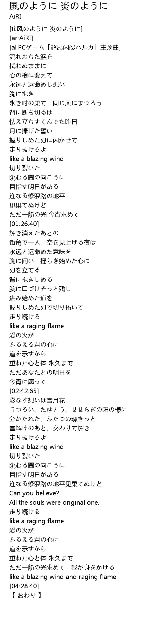 | [04:21.78] | like a blazing wind and raging flame |