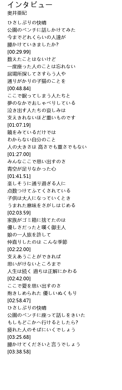 | [03:12.64] | 公園のベンチに座って話しをきいた |