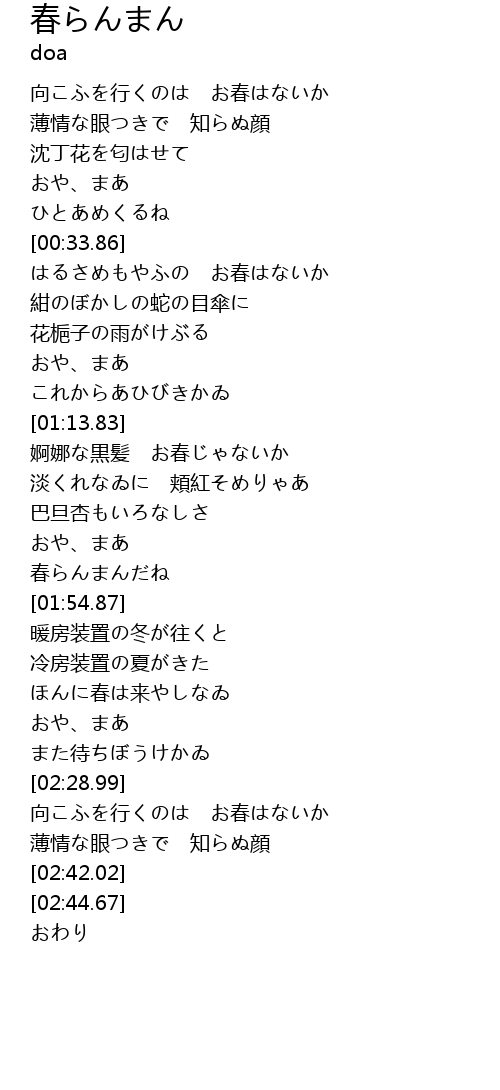 | [00:49.49] | はるさめもやふの お春はないか |