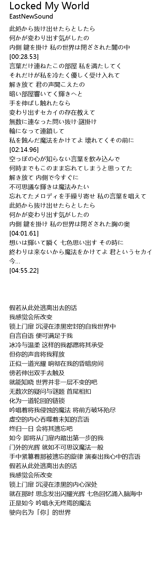 | [03:47.76] | 内側 鍵を掛け 私の世界は閉ざされた胸の奥 |