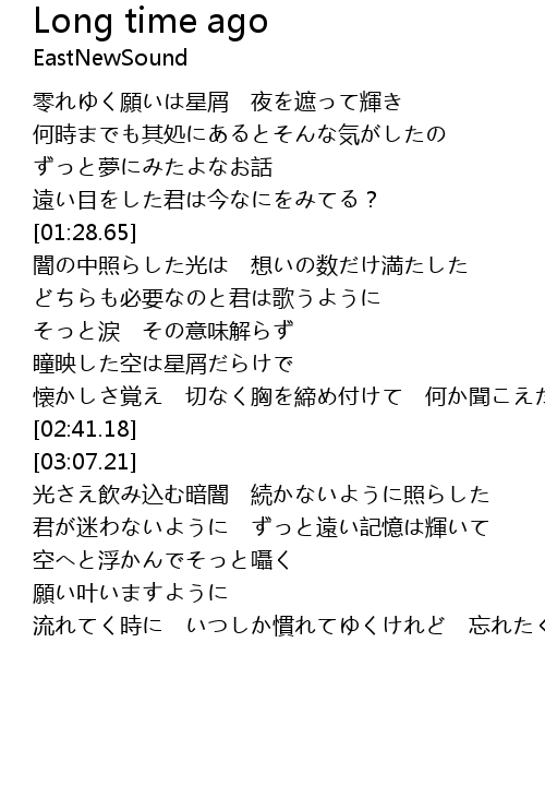 | [03:22.03] | 君が迷わないように ずっと遠い記憶は輝いて |