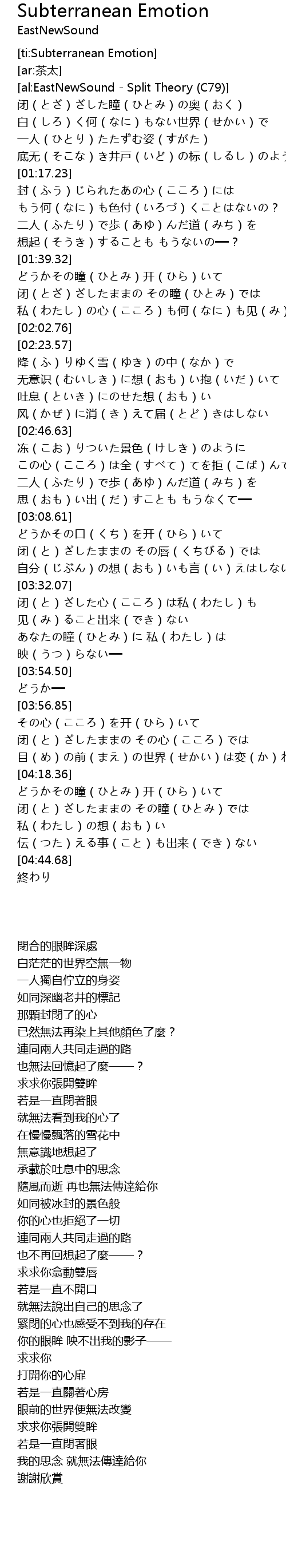 | [03:32.46] | 闭(と)ざした心(こころ)は私(わたし)も 见(み)ること出来(でき)ない |