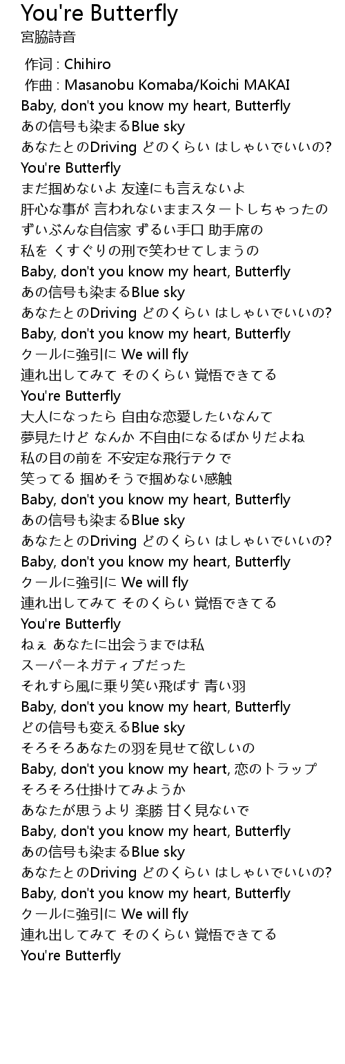 | [02:31.419] | Baby, don' t you know my heart, Butterfly |