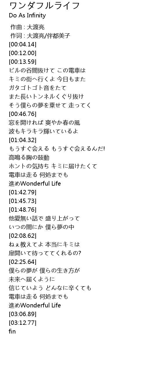 | [00:01.00] | 作词 : 大渡亮/伴都美子 |