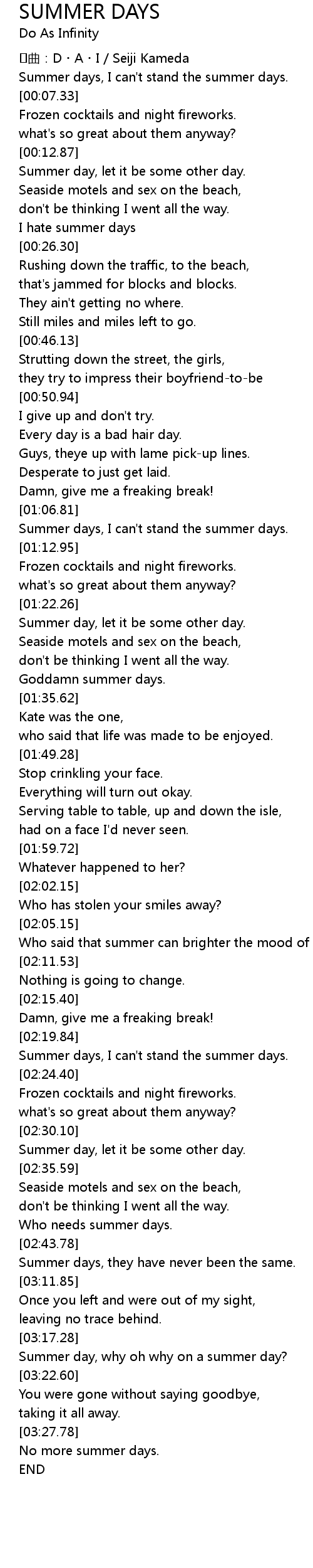 | [02:20.41] | Summer days, I can't stand the summer days. |