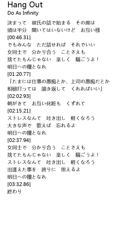 | [02:15.78] | ストレスなんて 吐き出し 軽くなろう |
