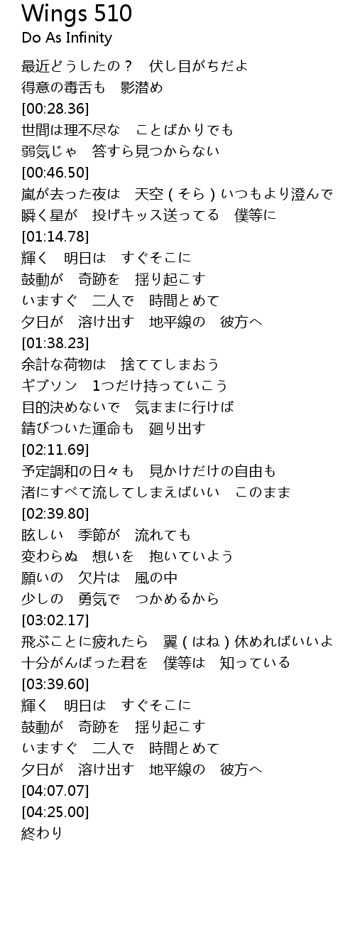 | [03:21.08] | 飛ぶことに疲れたら 翼(はね)休めればいいよ |