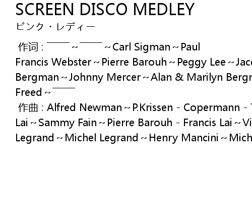 | [00:00.000] | 作词 : ―――――~―――――~Carl Sigman~Paul Francis Webster~Pierre Barouh~Peggy Lee~Jacques Demy~Alan & Marilyn Bergman~Johnny Mercer~Alan & Marilyn Bergman~Arthur Freed~――――― |
