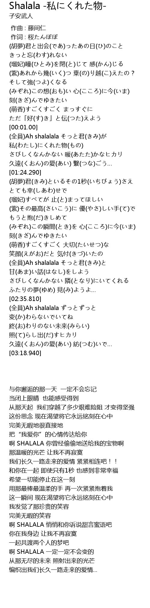 | [01:00.680] | (全員)Ah shalalala そっと君(きみ)が 私(わたし)にくれた物(もの) |