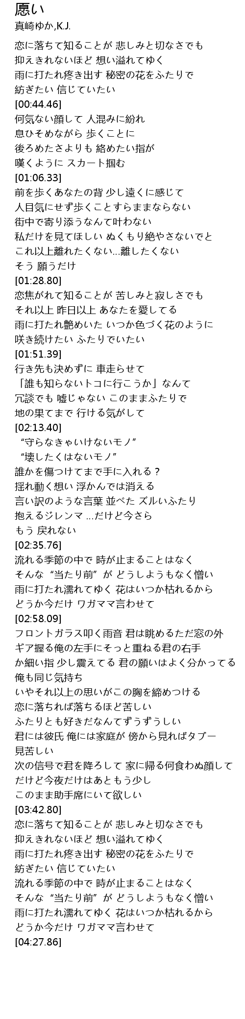 | [03:37.08] | だけど今夜だけはあともう少し このまま助手席にいて欲しい |