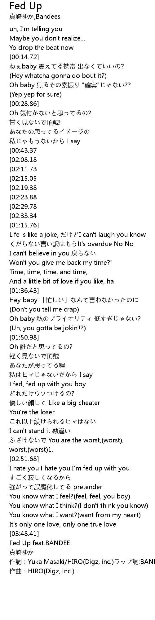 | [03:05.26][02:08.18][00:46.44] | I' m fed up! bi |