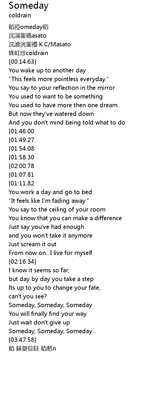 | [03:03.18][02:00.78][01:02.20] | Someday, someday, someday |