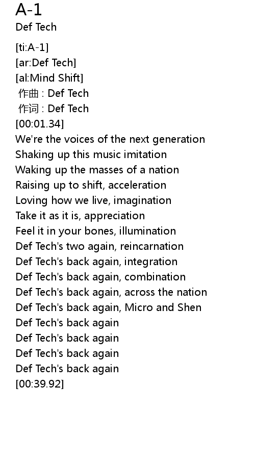 | [00:29.49] | Def Tech' s back again, Micro and Shen |