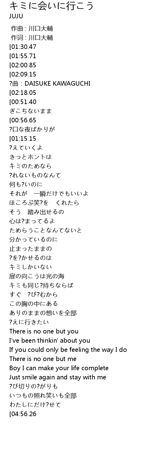 | [00:01.00][01:30.47][01:51.69][03:00.27][03:21.33][04:03.55][04:24.58] | キミに会いに行こう |