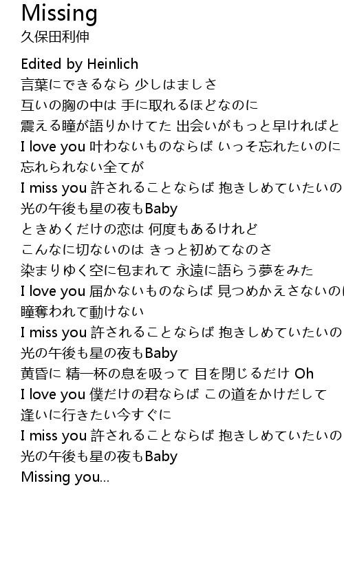 | [03:22.83] | I miss you 許されることならば 抱きしめていたいのさ |