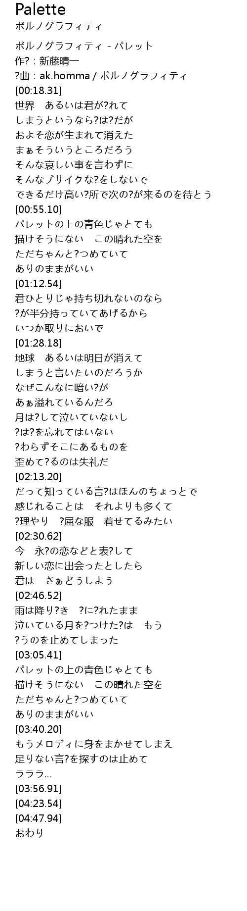 | [00:00.00] | ポルノグラフィティ - パレット |