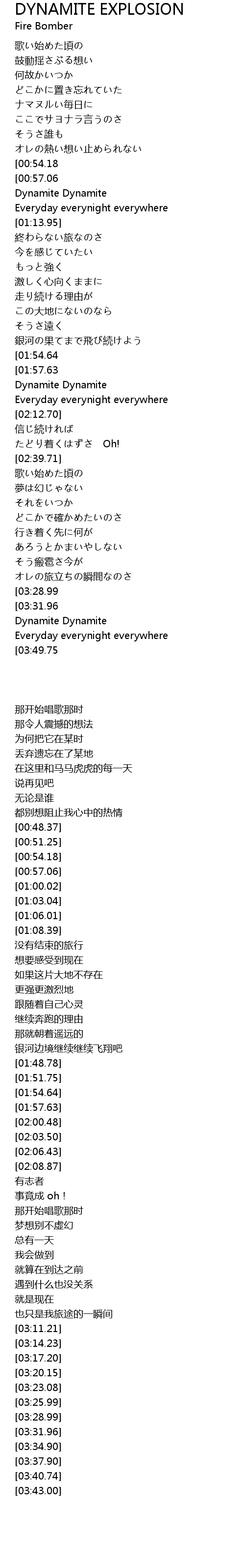 | [02:03.50][01:57.63][01:51.75] | Dynamite explosion once again |
