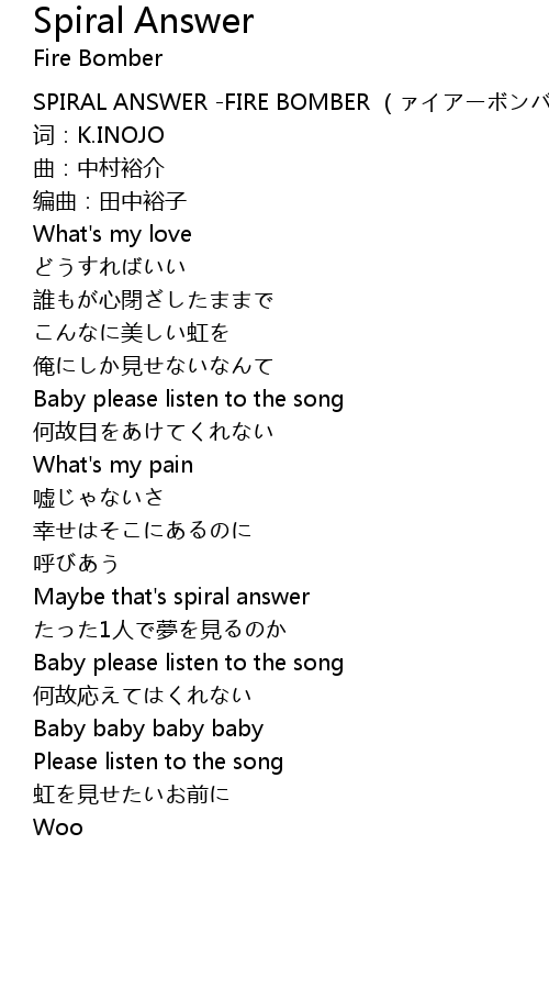 | [00:00.00] | SPIRAL ANSWER -FIRE BOMBER (ァイアーボンバー) |