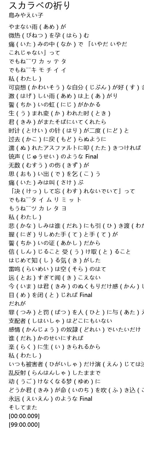 | [03:35.17] | 私(わたし) いつも被害者(ひがいしゃ)だけ演(えん)じては泣(な)いていたよ |